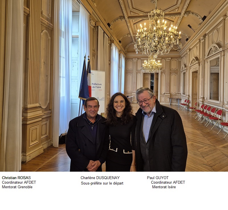 L'ensemble des services de l’État ainsi que des élus départementaux et régionaux étaient présents. Il a été fait état de son efficacité sur le territoire et sa capacité à faire adhérer les différents acteurs sur des projets innovants, telle que la découverte des métiers de la montagne à des jeunes collégiens et lycées de l'agglomération Grenobloise. Il est à noter que l'AFDET a été citée une première fois dans le discours de la Préfète pour illustrer l'implication de Mme Dusquenay sur notre dynamique du mentorat. Cette dernière a venté le mérite de l' AFDET pour son implication et son professionnalisme.